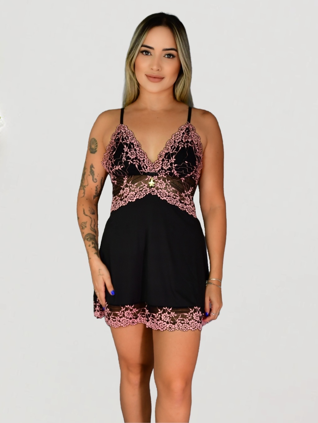 Camisola sensual, preto com renda francesa rose, elegância e bom gosto! Renda macia de qualidade.